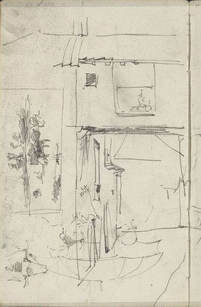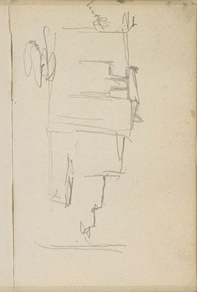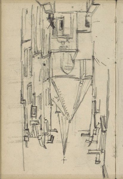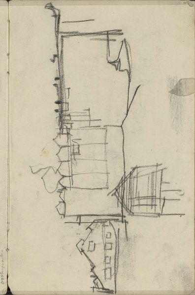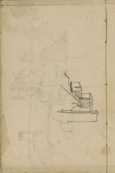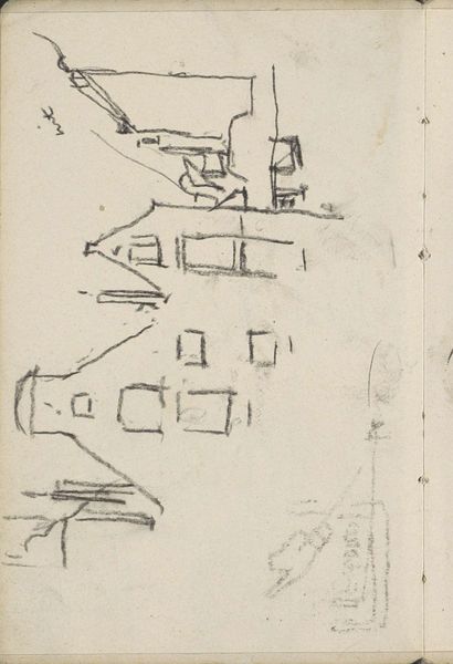 Editor: Here we have George Hendrik Breitner's "Studieblad met een kar, schoorstenen en hijsblokken," a pencil drawing from around 1880-1882. It feels almost like a memory, a fleeting glimpse of an industrial scene. What first catches your eye? Curator: The quick, almost frantic lines pull me in. Notice how the chimneys and block and tackles are rendered not with precision, but with a kind of energetic shorthand. To me, they speak to a moment in time where industry was rapidly transforming the landscape – a sense of change that would be burned into cultural memory. What do those sharp, angular forms suggest to you? Editor: A sense of starkness, maybe even a bit ominous. I suppose because these shapes could become looming structures on the environment and inhabitants. But that can't be everything, right? Curator: Indeed. But that also suggests its symbolic charge. Consider how these images—carts, chimneys—functioned in the popular imagination of the late 19th century. They represent not just labor, but also progress, modernity, even anxiety about a changing world. How do you see that anxiety manifest here, visually? Editor: Perhaps it’s the incompleteness of the sketch? It feels unfinished, like the city itself is still under construction and changing rapidly? The lines even seem to cross out and interfere. Curator: Precisely. Breitner captures that sense of becoming. Notice how these industrial motifs recur throughout his work, almost as a visual signature. How do you think his consistent return to these themes shaped the narrative around industrialization at the time? Editor: It's like he’s embedding this new urban landscape into our collective consciousness, almost forcing us to confront it. Thank you for bringing up the idea of collective memory! I would not have seen those links if I had seen this work alone. Curator: It is in precisely those interconnections and those shared experiences that we come to more fully understand what the drawing shows and symbolizes for us today.