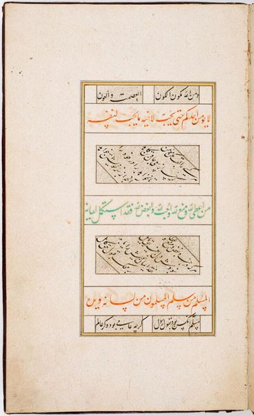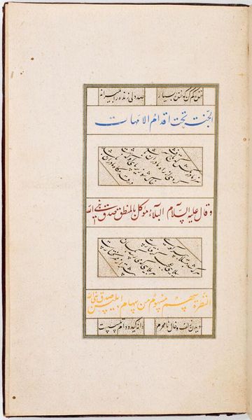 Curator: This is Folio 127, from a manuscript of the Divan of Anvari, attributed to Manohar. Look at the geometry of script and border. Editor: It feels quite balanced and ordered, even though I can't understand the text. The visual weight is distributed evenly across the page. Curator: Exactly. The text itself becomes a visual element, a pattern. And the way the words are written, notice how they might evoke a sense of cultural memory, a continuity of tradition and artistry. Editor: I see it. The script itself carries a weight of history and significance. The formal qualities and framing give it a sense of timelessness. A sense of visual and textual harmony. Curator: It's fascinating how simple lines and elegant calligraphy converge. It reminds us how much meaning can be embedded in design.