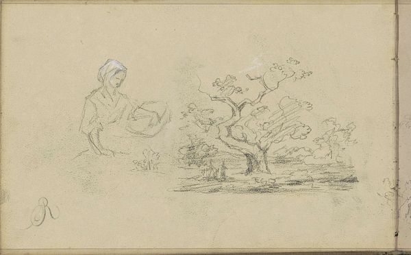 Curator: This is "Woman Washing Clothes in a River," a pencil drawing from 1874 by Willem Cornelis Rip. What are your first thoughts? Editor: Immediately, a kind of poignant stillness. It's quiet, even though you know there would be the sounds of the water, the cloth being wrung, maybe the woman humming to herself. A sense of everyday life rendered with such delicate lines. Curator: It's fascinating how Rip captures that feeling with such sparse detail. The river, for instance, is suggested with the simplest of strokes, yet you feel the cool, flowing water. There's a directness in the composition—a genre scene stripped down to its most essential elements. Water, earth, life. The eternal toil, really. Editor: Exactly. The donkey standing motionless in the background… almost ghostly, blending into the landscape. And the woman herself, her face hidden, absorbed completely by her task. It’s a symbol for anonymity, of disappearing within the routine and endless demands of life. And that sketch up in the right-hand corner adds this dreamlike quality, the freedom of pure uninhibited creativity, as well. Curator: It speaks volumes about the realities of rural life in the 19th century. Women's labor was often invisible, yet essential to survival. Water, of course, in this context, represents purification but also the cleansing of social boundaries. Remember that water was historically also the meeting place for a village and even town gatherings. The woman herself represents the life-giving aspect of water and fertility. Editor: I love how the almost hurried style really evokes fleeting time itself, capturing not just a woman but the flow of existence in a quiet moment that holds entire universes. What could the artist have been doing that day, what he saw that pulled his interest towards rendering it in such a soft but powerful way? Curator: An intimate and evocative observation of ordinary life turned into a window into social context. Editor: Making it something that, though simple, allows you to just stop and dream. I mean, what could be better?