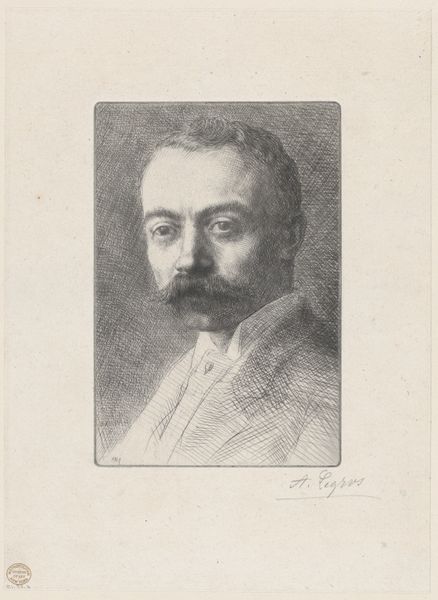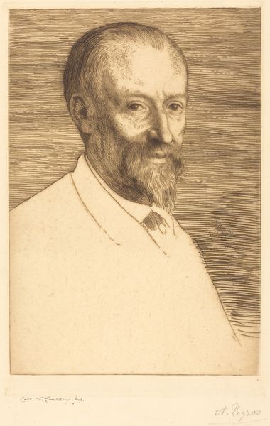Alphonse Legros created this etching, "Portrait of Edward D. Adams from a Trial Plate," using drypoint and etching. Notice the understated composition, where the subdued gray tones and delicate lines create an intimate, almost ghostly presence. The meticulous network of lines articulates the form of Edward D. Adams, emphasizing his facial features and the texture of his attire. Legros, working in the late 19th century, engaged with the realist movement, focusing on direct observation and a commitment to depicting the world as he saw it. The formal techniques mirror an interest in capturing the immediacy of life. The trial plate aspect reveals a process of refinement, a self-conscious awareness of the artist's hand in shaping the image. Consider how this emphasis on the artistic process destabilizes the conventional notion of a portrait as a straightforward representation. It invites us to contemplate the layers of construction involved in creating a likeness.