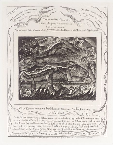 Editor: This is William Blake's "And when they lifted up their eyes afar off," a print housed at the Harvard Art Museums. The figures seem to be engulfed by grief. What strikes you about the composition? Curator: The dynamism of the lines, particularly in the figure on the left, and the contrast with the stillness of the central figures, creates a powerful tension. Note also the symmetry of the composition, framing the central scene. What do these formal choices suggest to you? Editor: Perhaps a struggle between action and resignation? I hadn't considered the symmetry before. Curator: Precisely. Blake masterfully uses form to convey complex emotional states. The text, too, functions as an intrinsic part of the overall design. Editor: It’s amazing how much the formal elements contribute to the emotional impact of the piece. Curator: Indeed, Blake was a visionary in understanding the unity of form and content.