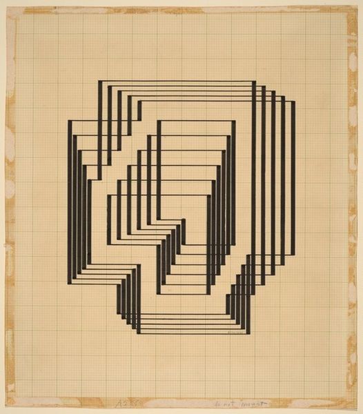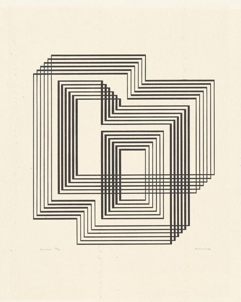 Curator: Right, let’s spend a moment with Josef Albers' "Graphic Tectonic," created in 1941. It’s a print that really plays with line and form in such an interesting way. Editor: My first thought? It’s utterly hypnotic. Like looking at a blueprint for a building that could only exist in Escher’s wildest dreams. The interplay of lines just grabs your attention. Curator: Albers was a key figure bridging the Bauhaus tradition with American modernism. This work reflects his engagement with geometric abstraction. There's this underlying grid, and on top of it, we see this complex pattern unfolding… almost like a maze. It has op-art elements, don’t you think? Editor: Absolutely! It's almost unsettling, isn't it? The more you look, the more the lines seem to vibrate. I get this sensation of depth where there is none, which makes me think about perspective as a tool to shift realities on paper. Like Albers wants us to question what is actually there. Or is he creating pathways in our minds? Curator: That’s interesting, thinking about pathways and the idea of navigation within the piece. Albers began to formulate his influential color theories around this time, and although "Graphic Tectonic" is monochrome, you can see his core principles of exploring visual perception already emerging. There’s such meticulous control here, even within apparent simplicity. Editor: Meticulous, definitely. But what's amazing is how it doesn't feel cold or sterile. It has soul, which pulls me in. You almost expect the lines to start moving, maybe even rearrange themselves right before your eyes! Curator: It speaks to the potential energy held within minimalist form, doesn’t it? This was created during a turbulent time, just as World War II was escalating. There's a fascinating tension in this tightly controlled structure – a sense of order amidst chaos. Editor: True. And I’m struck by the idea that maybe within constraint – in the face of chaos as you put it – real creative possibilities take hold. “Graphic Tectonic” sort of screams that paradox, you know? Curator: I agree. It encourages you to think, not just look. It's a work that lingers in your mind. Editor: Yes, a maze I think I’ll revisit.