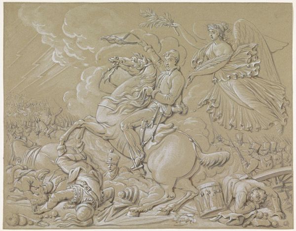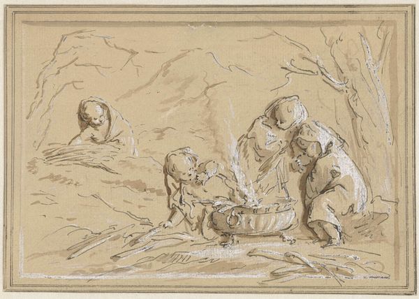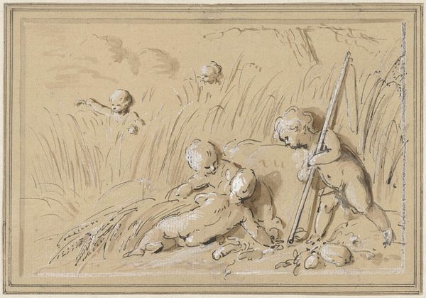 Jacob de Wit rendered this small drawing, "Herfst," in brown ink and wash, heightened with white over a sketch in graphite. De Wit was working in the Dutch Republic during the late Baroque and Rococo periods, a time when the representation of idealized cherubic figures was used to evoke classical allegories. The abundance of cherubs here, combined with the presence of grapes being collected in a bowl, suggests an allegorical representation of autumn, or "Herfst" in Dutch. These figures, while seemingly innocent, reflect the cultural values of the time, particularly around childhood and purity. De Wit’s use of light and shadow lends a tactile quality to the cherubs, making their forms almost palpable. The drawing invites us to reflect on the ways in which innocence and nature have been idealized in art, often masking deeper societal values and beliefs. The cherubs, frozen in their allegorical roles, prompt us to consider the complex interplay between representation, identity, and cultural meaning.