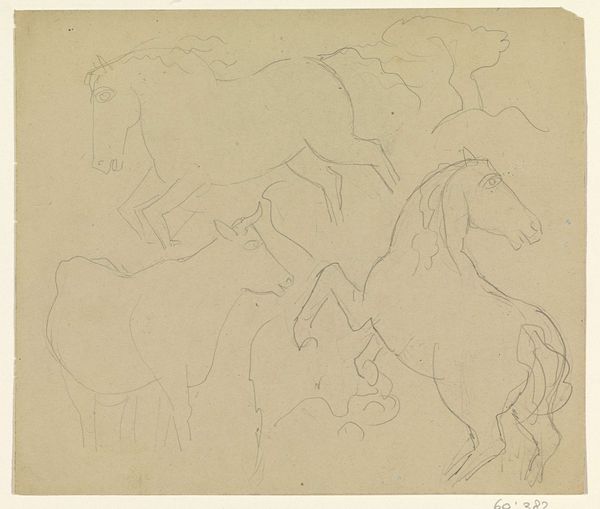 Editor: We're looking at "Groep muilezels" by Auguste Raffet, created sometime between 1814 and 1860. It’s a pencil drawing, currently held at the Rijksmuseum. It’s delicate, almost like a fleeting observation. What can you tell me about this piece? Curator: This unassuming sketch offers a glimpse into 19th-century military life. Raffet, known for his lithographs of Napoleonic campaigns, likely made this preparatory drawing to capture the everyday realities of troop movements. Mules were crucial for transporting supplies. Note how Raffet focuses not on grand battle scenes, but on the labor these animals endured. It invites reflection on the social impact of military campaigns and logistics. How might its quiet realism challenge conventional war depictions? Editor: That's interesting. I hadn't considered the social commentary angle. The rough sketches lend a certain authenticity. Do you think it served a specific purpose, other than as preparation for lithographs? Curator: Absolutely. Beyond military campaigns, this type of drawing had commercial value. Increased literacy and access to print media created a market for images depicting everyday life. Raffet catered to that market by portraying "real life" scenarios. How does that relate to realism as an artistic movement? Editor: That connection to a growing consumer culture makes a lot of sense! I'm struck by how such a simple drawing can open up so many different social and artistic avenues. Curator: Precisely. It highlights the importance of looking beyond aesthetic qualities to understand an artwork's place within its broader historical and cultural contexts.