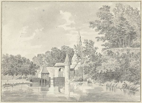 This drawing is part of a long rectangular drawing that was once cut in two. The right section is now in the Museum Boijmans Van Beuningen, Rotterdam. The original scene represented both the Zuid-Holland town of Geervliet and the walled Hof van Putten Castle. Despite missing its right side, the charming drawing can stand alone thanks to the cropping of the tree in the foreground and the painterly effect of the brush and grey wash.