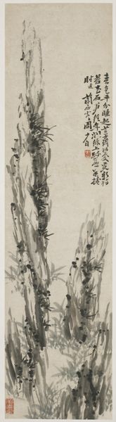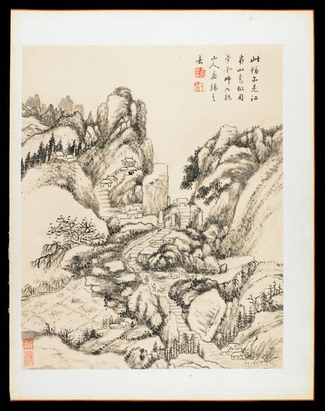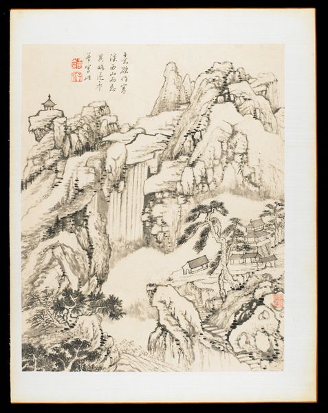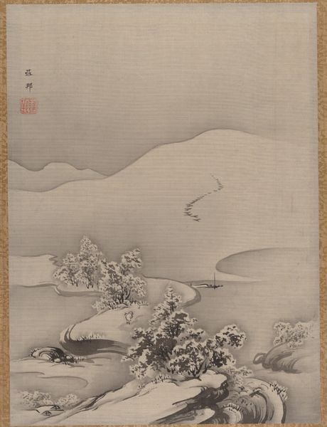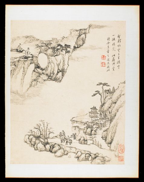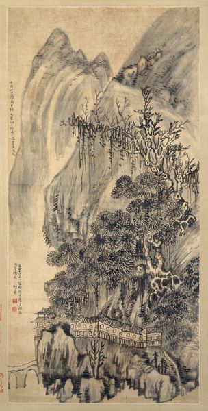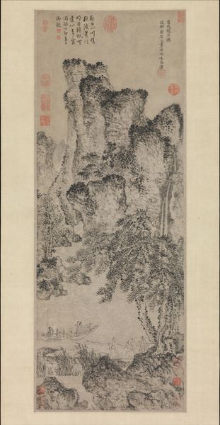 Editor: Here we have Shen Zhou's "Anchorage on a Rainy Night," created in ink on paper around 1477. The subdued palette and layered brushstrokes give the scene a sense of quietude, almost melancholy. How do you interpret this work through its formal qualities? Curator: The manipulation of ink is especially compelling. Note how varying ink washes generate a palpable atmospheric effect; the artist establishes depth by using contrasting dark and light tones to create a hazy distance. How does this monochromatic technique further inform your initial observation? Editor: The atmospheric perspective really does guide the eye through the composition. It makes the mountain feel so immense and looming. Does the composition imply symbolic significance? Curator: Observe how the structure guides the viewer’s eye—the mountain ascends prominently from the bottom third of the scroll. What message emerges from such a form, carefully positioned? It does invoke conventional landscape arrangements—the macrocosmic arrangement and the microcosmic brush techniques generate both literal and symbolic interpretations. Editor: The interplay between void and solid creates such a contemplative visual experience. I never would have looked at the landscape's brushstrokes this way. Thank you for helping me look at this with a new framework! Curator: My pleasure! Considering form in artistic practice opens us to diverse interpretations.