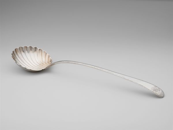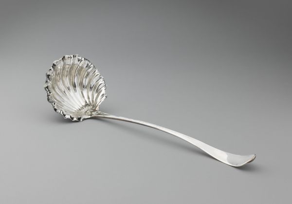 Editor: So this is Joseph Richardson Jr.’s "Ladle," made sometime between 1777 and 1790. It’s silver, and resides here at the Met. It's deceptively simple, isn’t it? The curve of the handle almost feels…alive. What do you see in a piece like this? Curator: Ah, yes. A seemingly humble object, elevated to art. Look at the shell shape of the bowl. Do you notice how the ridged lines radiate outwards? Consider how shells, and particularly scallops, are potent symbols of pilgrimage, rebirth, and even divinity, harking back to Venus, born of the sea. This reference to classical antiquity via the Rococo style reminds us of continuity through time, doesn't it? Editor: I didn’t pick up on that. So, a simple ladle isn’t just a tool; it's layered with meaning? Curator: Precisely. Even the silver itself carries weight. Silver, alchemically linked to the moon, often symbolizes purity and clarity. In the late 18th century, possessing such an object spoke volumes about the owner’s status, aspirations, and engagement with cultural narratives. What sort of ‘broth’ was being served by its owner in the nascent republic, symbolically speaking? Editor: That makes me think about who got to partake in that symbolic ‘broth,’ and who was excluded. It's both beautiful and thought-provoking. Curator: Indeed. Everyday objects can become powerful reminders of shared history and cultural values. It is a beautiful piece of cultural memory. Editor: I’ll definitely look at silverware differently now. Thanks!