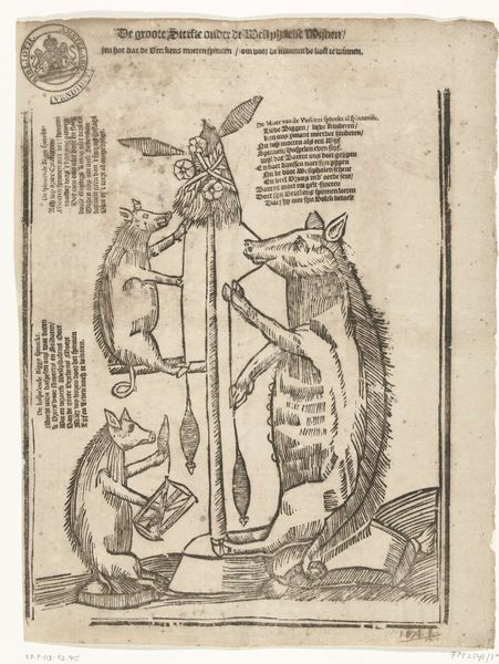 Curator: Here we have an engraving, drawing and print "Geen nutter dier voor rot en muis / Als een mooi katje in uw huis. / Want het doorsnuffeld alle hoeken / om dit gedierte op te zoeken," made between 1781 and 1828, credited to Jan Hendriksen. It includes text, textile and depicts a cat. What's your first impression? Editor: Well, it’s…certainly a cat. There's something deeply unsettling, almost humorous, about its rigidly upright posture and vacant stare. It feels less like a portrait of a cat and more like a bizarre mascot. Curator: These so-called “prenten” like this were designed to be both decorative and didactic, meant for a wider audience, to hang in homes. The artist wasn't trying to make fine art; this was meant to impart morals and popular wisdom. Consider the Dutch Golden Age context and the burgeoning print culture! Editor: Ah, so mass-produced wisdom, eh? Explains the stiff, slightly awkward composition, and that blocky font. There’s also something kind of earnest and folk-arty about that tabby patterning and color that’s really growing on me. This has been made to have pride of place in a home. I can see someone really being soothed by the sight of it and its wise little homilies. Curator: It reflects the anxieties of the time regarding pest control and the comforting presence of a domestic animal, as a reflection of bourgeois values. Notice how the inscription beneath reinforces this theme – it really drove home the point, creating a sense of order and domesticity during tumultuous times. Editor: It is a really bizarre domestic idyll, and of course completely fails. But also succeeds. This awkward folk kitty both celebrates domesticity and, just perhaps, subverts it a little with its intense weirdness. Curator: Precisely. These genre painting often present themselves as simply moral messages, they’re complex reflections of broader social tensions and cultural beliefs. Editor: Yeah. Thanks, cat, I feel…better armed against my impending sense of bourgeois angst now. This will really stick with me for a while. Curator: Absolutely! Hopefully, now, you'll view folk art quite differently.