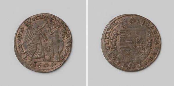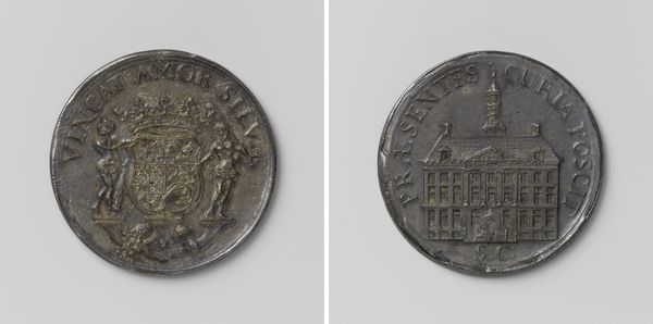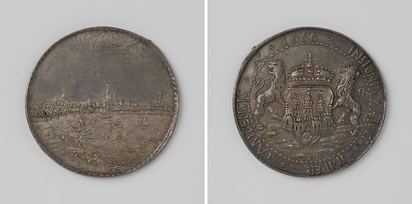 Curator: Right now we're looking at the "Vroedschapspenning van de stad Delft," a medal crafted by Gijsbert van Moelingen sometime between 1776 and 1779. It is struck in metal, a detailed circular relief. What catches your eye first about this piece? Editor: Its scale! It looks deceptively humble at first glance but the detail, wow, it's immense, especially on the cityscape side with all the tiny figures lining the canal. It whispers of vast gatherings, like history compressed into a pocket-sized universe. Curator: Exactly! It’s more than just a pretty cityscape, of course. These vroedschapspenningen, were essentially commemorative coins gifted to members of the city council, the vroedschap, in Delft. They functioned as status symbols but also as potent reminders of civic duty and collective identity. Editor: So, imagine receiving one of these – a little weighty power in the palm of your hand! Does it affect their actions? The weight of history or responsibility might influence their daily workings… Curator: I think so. You know, on one side you see this rather idealised image of Delft itself, full of orderly lines, prosperous-looking buildings, reinforcing the notion of a well-governed city. The other side presents what appears to be the City Hall. Editor: Almost like a visual promise. "We will be this strong building" – but looking at it practically – I mean, imagine receiving a lump of metal. Beautiful yes but were people really so moved by symbols back then? Curator: It's easy to underestimate symbols now, but think of national flags, or even modern political pins! Back then, in a society steeped in tradition, these objects were crucial in shaping public perception and reinforcing the authority of the ruling class. These weren't throwaway items. They spoke volumes. Editor: And to know a place through such objects really connects to them differently from a picture… looking at the relief work now I imagine that at the time this must have created such an emotional response to the art—making them believe in a powerful idea. Curator: A potent reminder that even the smallest of objects can carry tremendous social weight and artistic complexity! Editor: Precisely! These kinds of reflections highlight the importance of not simply seeing these artworks but of placing them in their appropriate political and social context!