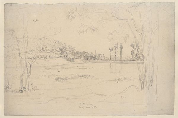 Curator: Looking at Washington Allston's "Landscape with Trees and Mountain," I'm immediately struck by its dreamlike quality. It's an ink wash, quite small, but evokes such a sense of expansive space. Editor: For me, that dreaminess has a sharp edge. Allston, writing and painting in the early 19th century, was wrestling with ideas of nationhood, progress, and their potential costs. This feels like a reflection on those tensions. Curator: Absolutely. The classical architecture juxtaposed with the natural landscape suggests a dialogue, or perhaps a struggle, between civilization and nature. It's romantic, in a sense, but also a bit melancholic. Like a memory fading. Editor: Or maybe it's a premonition of what industrialization and expansion might erase. The scale of the landscape against the architecture seems to hint at nature's ultimate power and endurance. Curator: You're right. It's interesting how he uses these loose, flowing lines to suggest form, but leaves so much open to interpretation. It feels unfinished, almost like a sketch, yet incredibly evocative. Editor: Which allows it to speak to different generations and their anxieties. Allston's landscape resonates even now as we grapple with climate change and the legacy of colonialism. It’s a little ghost story about progress.