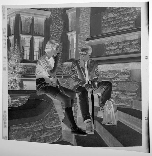 Editor: This is Jack Gould’s gelatin silver print, “Untitled (priest walking in cloister passageway)". The strong diagonal lines and contrasts give it a dramatic feel, despite the small scale. What is your read on this intriguing composition? Curator: Indeed. Note the sharp contrasts. Light and shadow interplay to create a dynamic tension. Observe how Gould uses architectural elements—the arches, the passageway—to frame the figure. The print’s success relies on its manipulation of form. Editor: So, you focus on the composition and contrast. Is there anything else you see in its structure? Curator: The negative space is as crucial as the figure itself. It offers a balance. The lines offer depth, drawing the eye into the composition. It is a study in contrasts and geometry. Editor: I see what you mean. I'll definitely be looking for geometric relationships in photography from now on!