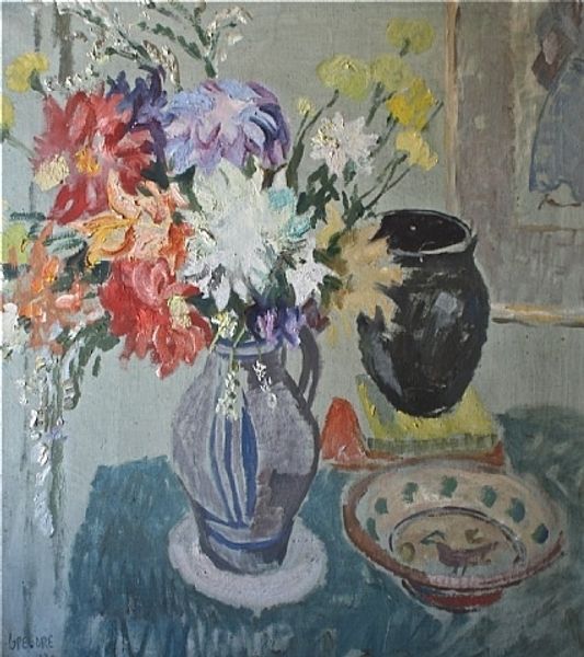 Editor: This is "Fleurs dans un intérieur" by Jacques-Émile Blanche, painted in 1927. It's an oil painting, and my first impression is just how vibrant it is. All those colours! What strikes you most about this piece? Curator: Ah, Blanche! I feel this painting is a real reflection of his time, that post-war bloom, a desire for beauty after the ashes. Those bold strokes are not just painting flowers, they're painting hope, wouldn't you say? It's almost like you can smell their scent, if one can smell colour, that is! Editor: Absolutely, there's a definite sense of optimism! I’m interested in how loose and impressionistic the style is for a 1927 painting, but still very grounded in reality. Curator: Indeed! Although Impressionism was fading somewhat, many artists held onto the fleeting moments it captures so well, as does Blanche. You know, sometimes I think artists aren't just painting what they see, but how they *feel*. Like he’s trying to hold onto that last gasp of summer as autumn approached. Does that make sense to you? Editor: That totally makes sense! Seeing the painting as a representation of holding onto something really adds another layer. Curator: That interplay between realism and emotional impressionism, the way light seems to dance even within an interior, that’s the delicious tension here, for me at least. I guess everyone can find their own truth here... Editor: It’s given me a whole new way of thinking about impressionism. It’s not just landscapes, it's feelings on a canvas!