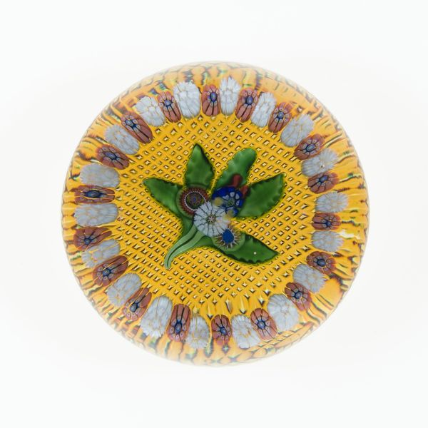 This glass paperweight, by Compagnie de Saint Louis, presents an intricate display of color and form, encapsulated within a clear, dome-shaped structure. The intense yellow background dramatically offsets the bouquet of millefiori flowers at its center. The arrangement of the flowers and leaves is meticulously organized, yet it possesses a certain organic freedom. Encased in glass, the structural containment paradoxically enhances the naturalistic representation. The interplay of color—the deep greens of the leaves, the varying hues of the floral blossoms, all set against the yellow—creates a vibrant sensory experience. The object's transparency introduces an element of semiotics, as the viewer's perspective shifts, altering the relationship between the internal composition and the surrounding environment. This allows the paperweight to function not just as a decorative object but as a lens through which we perceive our surroundings. Its structured form invites ongoing interpretation and dialogue.
