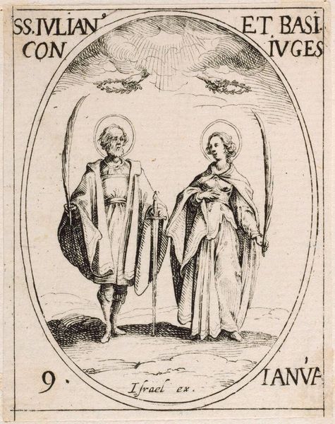 Editor: Here we have Jacques Callot's miniature print, "Name of Jesus". It's incredibly detailed, almost like looking into another world. There's a bishop and an angel exchanging something near the 'IHS' symbol. What do you see in this piece? Curator: It feels like a divine transaction, doesn't it? Callot masterfully uses the small space to express something truly monumental. The angel, almost urgent, and the bishop, somber, thoughtful. Perhaps it's about the dissemination of faith. What does it spark in you? Editor: Hmm, it definitely brings to mind a sharing of knowledge, but maybe also a struggle with faith? That bishop looks a bit hesitant! I appreciate how compact yet complex this small print is. Curator: Precisely! Callot reminds us that even within constraints, immense stories can unfold. It is wonderful how such a small artwork can spark such big ideas.