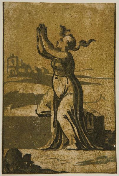 Curator: There's a kind of startled drama to this print, "Surprise," by Ugo da Carpi. The figure seems caught in a moment, almost mid-gesture. Editor: It’s like stumbling upon someone in their private reverie, isn't it? There’s an emotional nakedness despite the draped clothing. Curator: Da Carpi, who lived from 1480 to 1532, was quite innovative with the chiaroscuro woodcut, using multiple blocks to create tonal effects. It was his way of recreating drawings. Editor: The etching is interesting too, with the man stepping onto a stage of some kind. His hair looks like it’s also about to lift off his head! Curator: Yes, the theatricality of the scene is palpable. The very notion of “surprise” seems to be about revealing something that was previously hidden. Editor: And perhaps Da Carpi surprises us with his artistry, in the way he plays with light and shadow, revealing the beauty in the unexpected. Curator: Indeed, and maybe we, in turn, are surprised by our own emotional response to this image, centuries later.