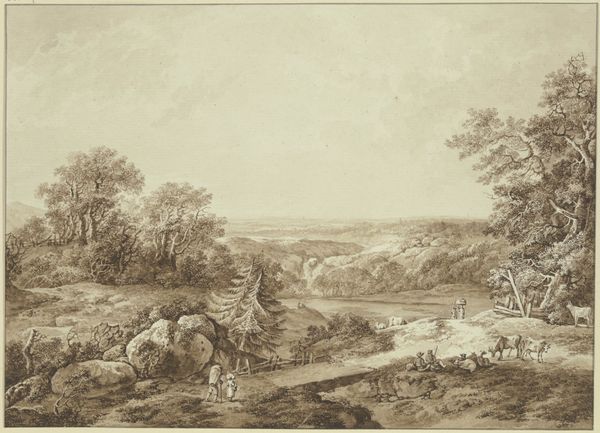 This is Martin von Molitor's "Landscape with a Waterfall and a Resting Family," an etching done in the late 18th or early 19th century. The scene's tonal uniformity creates a harmonious but also somewhat unsettling viewing experience. Molitor masterfully employs hatching and cross-hatching to create depth and volume. Look closely, and you'll notice how the density of the lines varies to suggest light and shadow, giving form to the trees, rocks, and figures. The composition is carefully structured, leading the eye from the foreground figures towards the distant landscape, framed by the large trees. The etching technique itself, with its precise lines, lends a sense of order and control to the depiction of nature, reflecting the Enlightenment's emphasis on reason and observation. However, the sheer detail and intricacy also point towards a Romantic sensibility, hinting at the sublime power and complexity inherent in the natural world. The family resting near the waterfall becomes a signifier for human interaction with nature. The artist compels us to consider how we perceive and interact with the landscapes that shape our understanding of the world.
