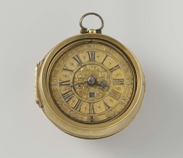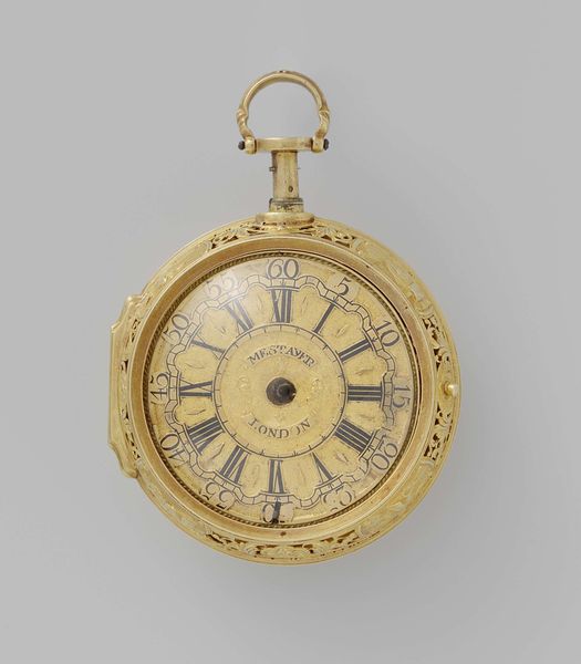 Editor: Here we have a pocket watch made of metal, dating back to sometime between 1800 and 1815. The watch's golden sheen and delicate craftsmanship give it a sense of old-world luxury. It really makes you wonder who it belonged to. What can you tell me about this particular watch and its cultural context? Curator: Absolutely. This watch, beyond its aesthetic appeal, speaks volumes about power dynamics and societal structures. Ask yourself, who during that era, particularly in the context of nascent industrial capitalism, had access to such refined time-keeping devices? This was not a tool for the working class. Editor: It’s interesting to think about who possessed it, because it really is beautiful. Were timepieces like these symbolic objects in the early 19th century? Curator: Indeed. The ownership of a watch, especially one so finely crafted, signified more than punctuality. It symbolized control, not only over one’s schedule but also over labor, resources, and even the perception of time itself. Consider how industrialized societies began imposing rigid temporal structures on workers – factory bells, shifts, regulated breaks. Owning a watch like this distanced the owner from that very control exerted over the working class. Editor: That’s a fascinating connection I hadn’t considered. It makes me rethink my initial appreciation, understanding now the socioeconomic implications embedded in this object. Curator: Precisely. It compels us to critically analyze objects through an intersectional lens. We see how race, class, and gender all intersect in the story of access, ownership, and symbolic capital this timepiece represents. Editor: I see that luxury items of the past are relics, filled with messages from their original society, not only related to craft or aesthetics. It definitely made me think critically! Curator: And critical thought, always focused on diverse and intersectional understandings, is what reveals our shared yet inequitable human past.