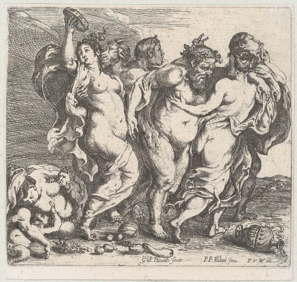 Curator: What a delightful chaos! Before us we have an engraving, "Acht kinderen spelen blindemannetje", which translates to eight children playing blind man's bluff. Cornelis Schut rendered this energetic scene sometime between 1618 and 1655. Editor: Energetic is an understatement! My first impression is that it seems almost brutally… joyous? So many fleshy little bodies scrambling about. A real baroque bacchanal of babies. I feel like I’ve stumbled into some forbidden revelry. Curator: Absolutely. The Baroque, known for its dramatic flair, certainly comes alive here. But, you know, behind all the cherubic chaos there’s a lot going on socially. This era sees the rise of genre painting, really capturing everyday life… idealized as it might be. But, I think it serves to illustrate how society has structured these rituals. Editor: How so? Is it that blind man's bluff becomes a microcosm of the world, complete with hierarchies and the disadvantaged literally stumbling around? Or, could we also question the very nature of ‘innocence’ when childhood is presented as something bordering on a carnal free-for-all? Curator: Perhaps both? Think of it—we project innocence onto children, and Schut delivers these chubby imps to poke a bit of fun at those lofty ideals, doesn't he? Note also how each cupid embodies a role: aggressor, guide, the confused and disoriented... it creates tension. There’s more narrative sophistication than one might first give credit. Editor: I completely agree about the sophistication; the artist uses line-work to create depth despite it being an engraving and offers so many possible narratives simultaneously. It really opens up a whole range of considerations about how children navigate societal structures. Even now in a very different environment, doesn't it? Curator: That’s what I love about Schut; this image manages to make the complexities of human nature so disarmingly adorable. Editor: A provocative sweetness, indeed. A great work that lets you see the world and the stage we construct so readily with new eyes.