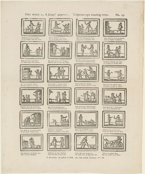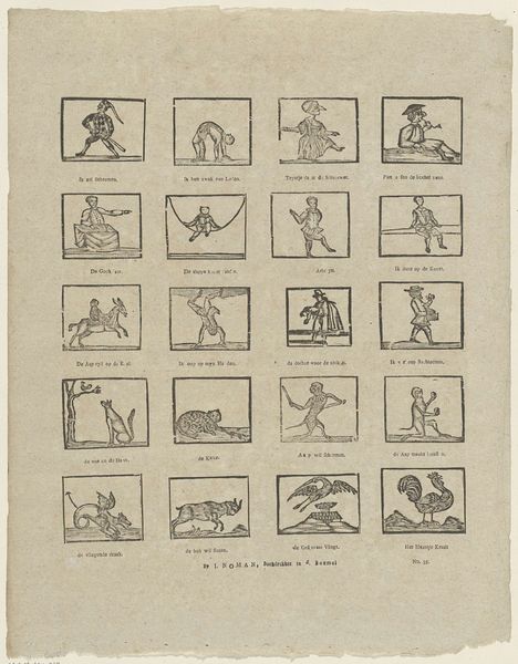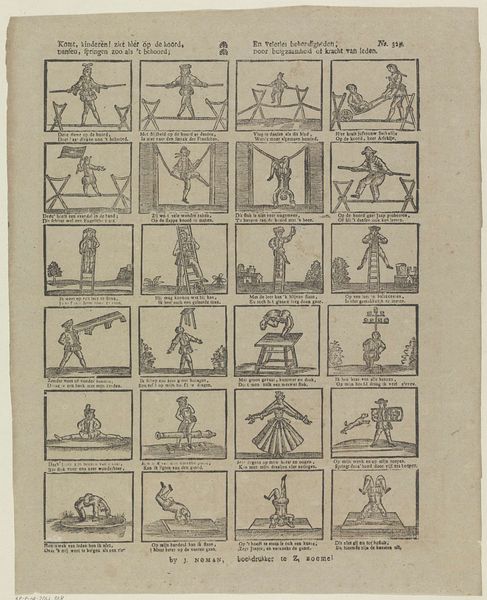 This print, "Onderscheidene Schermmeesters" by Schalekamp & Van de Grampel, presents a grid of scenes rendered in stark lines and graphic simplicity. Each framed panel captures a moment in a fencing duel, creating a sequential narrative across the page. The composition is rigidly structured; the use of uniform squares emphasizes the calculated nature of both art and combat. Each frame isolates gestures and postures, turning figures into semiotic signs which may be read almost as instructions. The figures are stylized and somewhat flattened. This reduction of form directs our focus to the choreography of motion and the geometry of conflict. This piece functions as a kind of proto-cinematic storyboard. It breaks down the dynamism of action into a series of static frames. The print is less about individual expression and more about codifying a set of physical and social interactions. The overall structure suggests an early attempt to dissect and understand movement through visual representation.