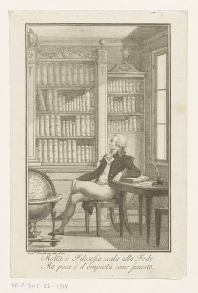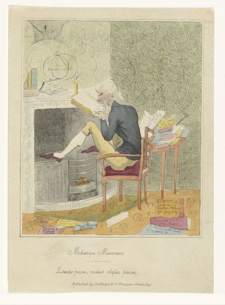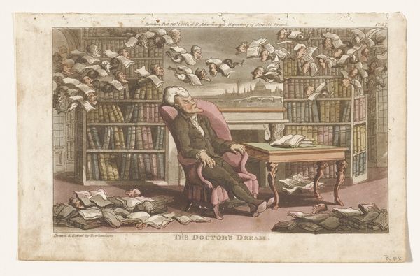 Curator: Thomas Rowlandson gave us this caricature "Doctor Syntax slapend in een bibliotheek," between 1812 and 1821. It's currently held at the Rijksmuseum. My immediate thought is of the paper itself; I imagine it handled quite differently than it is today. Editor: What a delightfully absurd scene. I'm struck by how dreamlike it feels. He's slumped in his chair, completely surrounded by these flying books with faces! Is that what literary success or failure feels like, a swarm of judgement? Curator: Perhaps. Or consider the social function of libraries then; they weren't simply repositories of knowledge, but also spaces where status was performed. Rowlandson uses watercolor and drawing techniques to gently satirize this environment and perhaps the doctor's ambition within it. Editor: There’s also something deeply relatable about this image. The allure of books and yet the undeniable temptation to nap amongst them. But what a clever trick with the floating faces – I can almost feel the weight of expectation pressing down, those books becoming judgmental cherubs or sneering gargoyles! Curator: Exactly! Look closer at the materials: watercolor allows for those translucent layers in the books and faces. It subtly mocks romantic ideals through humor and exaggeration of this figure. This isn't pure imagination; it's constructed with intent, using readily available materials for accessible critique. Editor: And in using such accessible materials – is Rowlandson inviting us, the viewer, to also find humor in what was then perceived as ‘high culture’? Or gently reminding us of the physical cost to accessing intellectual thought - books, like labor, become heavy in hand. I appreciate his light, sarcastic touch! It humanizes, perhaps, the rigor and demand for intellectual achievement in that period, even to the point of complete physical exhaustion. Curator: It's this blend of artistic skill and socio-political context which renders the piece poignant still today. Editor: Well said! Next time I'm feeling overwhelmed with books I’ll try to remember Doctor Syntax’s liberating nap. It is both reassuring and deeply funny!