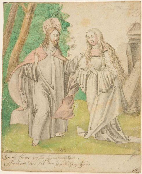 Editor: This piece, *Boccaccio ontvangt drie vrouwen*, or *Boccaccio Receives Three Women*, is thought to have been created around 1470 by an anonymous artist. It's a tempera, colored pencil, and drawing miniature. There's something very formal about the arrangement of the figures... almost theatrical. What are your initial thoughts when you look at it? Curator: It whispers of a cultural script, doesn't it? Consider the symbolic weight carried by each element: Boccaccio, cloaked and seated, representing knowledge and authority; the three women, adorned, approaching. Do their garments denote status or perhaps virtue? It's all deliberately staged. Note how their hands mirror one another: what narratives do you suppose the artist wished to suggest about femininity or agency at the time? Editor: So the mirrored hands, their positioning... It's like they’re not just presenting themselves, but perhaps a unified front? Do you think the choice of pale colors is also symbolic? Curator: Precisely! The paleness invokes a certain purity, doesn't it? Reflect on how white often signified innocence or spiritual light. The architecture too – what message does it intend to send? It all builds toward an encoding of social mores. How fascinating to see these performed. Editor: That's true! I was so focused on the figures I hadn’t thought about how even the setting contributes to this carefully constructed meaning. I now wonder what story this miniature seeks to tell. Curator: A good question! How is our reading then coloured by cultural context? By looking deeper, and posing critical questions about visual and symbolic meanings, this little painting starts to unveil its historical identity.