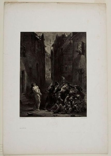 Editor: This is "Nachtelijk straattafereel met wanhopige vrouw en neergevallen man"—quite a mouthful! Adolphe Mouilleron created this drawing with ink sometime between 1848 and 1862. It's currently housed here at the Rijksmuseum. Gosh, it's bleak. What strikes me is how stark the despair feels. The woman looks absolutely shattered. What do you see in it? Curator: The raw emotion, yes. It’s practically clawing its way off the page. This work really dives deep into the kind of dramatic storytelling that artists of the Romantic era embraced, but it seems intensely personal, don't you think? It reminds me of Goya, especially in its unflinching gaze into the darkest corners of human experience. And notice how Mouilleron uses the darkness itself—the heavy ink—almost as another character. Have you ever felt swallowed by the night, just as these figures seem to be? Editor: Absolutely. That intense contrast makes it even more disturbing. So, is this kind of emotionally charged depiction typical for Mouilleron? Curator: Not especially, no. He actually spent much of his time working as a printmaker reproducing other artists' works, making his art more accessible. But he often created such expressive pieces. This work almost vibrates with nervous energy. I see it as an extremely heartfelt lament; a cry in the night captured on paper. And it gives me chills to think it was based on events that actually occurred. Editor: So it is an outstanding and heartfelt personal statement… that you can feel. Amazing, thanks! Curator: My pleasure. Each viewing reveals a little more of that dark landscape!