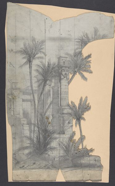 Curator: Eugene Ciceri's, "Design for a Stage Set at the Opéra, Paris" rendered between 1830 and 1890, provides a behind-the-scenes glimpse into 19th-century theatrical production, showcasing a meticulous pencil drawing on paper. Editor: Immediately, I see a delicate rendering. The sparseness makes me think of ghostly scenery awaiting vibrant color and the drama of the stage. It feels incomplete, a skeleton of a world ready to be brought to life. Curator: Indeed. The grid underlying the sketch reveals its intended functionality—a scaled template for scenic construction. Notice the classical landscape elements, reflecting the taste for historical themes common in opera of that period. The materiality speaks volumes about the division of artistic labor. Editor: Absolutely, it's fascinating to consider this piece as a blueprint rather than just a standalone artwork. It highlights how "art" often served very practical functions within a larger system of production. It’s a window into the collective labor that goes into illusion. The trees are a bit spooky if you ask me; do you know if there was anything a bit morbid about these operas or set of operas this backdrop could have been made for? Curator: While opera of that era embraced spectacle, morbidity wasn’t always central, though tragic themes certainly featured. What interests me is the tension between the hand-drawn quality and its ultimate industrial purpose, demonstrating how emerging technologies shaped artistic processes, with a material expression of control via design. Editor: I guess, for me, that intersection of the hand and machine lends this piece its quiet beauty. Knowing that so many hands were involved adds depth; it ceases to be a single artist's vision. Curator: Exactly! The commodification of art and aesthetic experience is already fully underway, reflected directly in its materiality. A stage set isn’t complete without actors, costumes, music and lights; together those components are the complete product to be consumed. Editor: Seeing the means of production here, sketched out with the plan apparent, helps reveal so much! Curator: I find it all exceptionally illustrative regarding the cultural industries of the 19th Century and thank you for giving me your insights today.