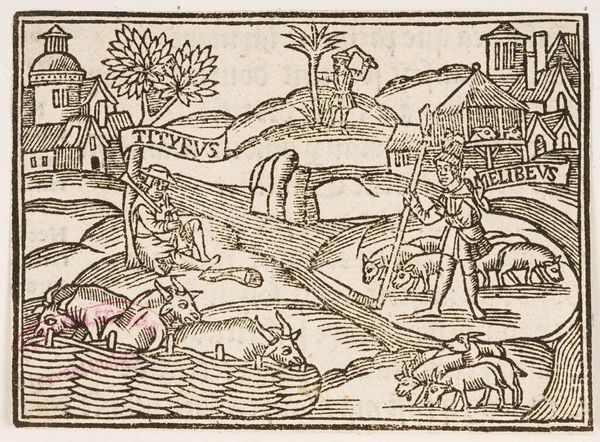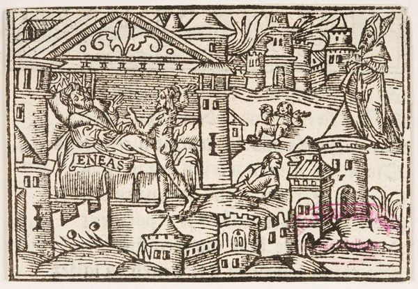 Curator: Illustration LXIV presents us with a fascinating woodcut, anonymous in origin, currently residing at the Harvard Art Museums. Editor: The stark black lines against the paper create a rather dramatic scene, wouldn't you agree? It's densely packed with figures and architectural elements. Curator: Yes, the density speaks to the labor involved in its production and dissemination as a reproduced image. Notice how the material limitations necessitate a simplification of form? Editor: And within that simplification, certain symbols stand out. The waterwheel, for example, signifies labor and industry, while the figures being carried suggest a scene of rescue or perhaps even abduction. Curator: Precisely! This interplay reveals the societal dynamics and values embedded in the image's very structure. Editor: I also find the placement of "Creta" and "Nasos" intriguing, labels that position the narrative geographically and ground its cultural significance within a historical context. Curator: A tangible connection to the landscape of its time! Editor: It's incredible how such basic materials can become imbued with so much historical meaning. Curator: Indeed, it urges us to consider the broader implications.