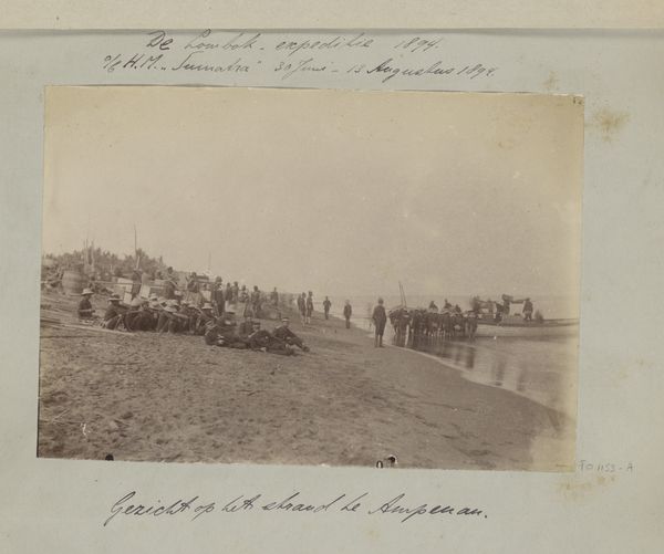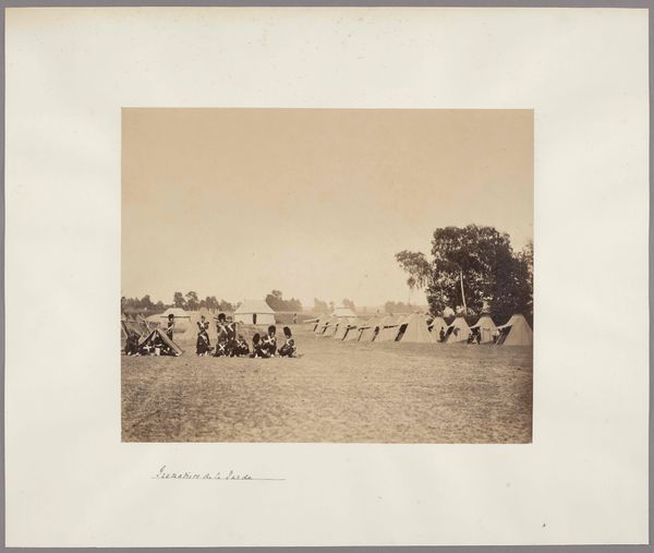 Curator: So, let's talk about this photograph, "[Bayonet Drill]," created sometime between 1861 and 1865. The artist? Egbert Guy Fowx. It’s a gelatin-silver print, currently housed here at the Metropolitan Museum. Editor: My first thought? Melancholy. It’s this ghostly, distant image—all those men in formation under a vast sky. It speaks volumes about discipline, duty, and the dehumanizing effects of war, even without seeing individual faces clearly. Curator: Precisely. There’s this striking formalism—the repetition of the figures, the linear precision—contrasted with the haziness of the background. Notice how Fowx frames the scene within an oval, almost as if peering through a looking glass into the past. Semiotically, the arrangement speaks to order, control, the mass mobilization, the idea of sacrificing the self for the cause. Editor: The "cause," always such a slippery slope, isn't it? I imagine standing there, boots muddy, heart heavy, another anonymous face in the crowd. And it makes you wonder, who are they really fighting for? And what are they hoping for? Besides, you know, to stay alive. Curator: I think there’s an undeniable tension here, and a great contrast to the grandiosity often associated with images of warfare. Fowx presents it instead with an understated quietness, a somber beauty. Editor: "Somber beauty," that's a good way to put it. But maybe also with a good dollop of terrifying alienation? All lined up like that? Each a cog in some awful machine? A machine pointed, invariably, at other humans? It really does haunt me, I tell you. Curator: This image truly challenges the romantic notions of warfare, showing, through its very composition and materiality, the humanity caught in the cogs of its gears. A very profound statement given the photographic practices of the Civil War Era. Editor: Yes, well, sometimes it takes a quiet photograph to scream the loudest.