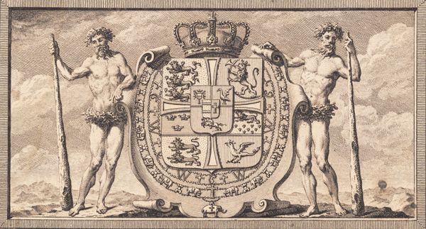 J.F. Clemens created "Det danske våben med vildmændene som skjoldholdere" using engraving. The composition presents a symmetrical arrangement, dominated by the Danish coat of arms at the center, flanked by two wildmen. The stark contrast of the engraving enhances the intricate details of the heraldic symbols and the figures. The texture created by the fine lines gives the image a tactile quality, inviting close inspection. The wildmen, serving as shield bearers, offer a compelling interplay between civilization and nature. The heraldic elements, meticulously rendered, speak to the socio-political structures of the time. The symmetry in the composition reflects the desire for order and balance, values of the Enlightenment period. This artwork can be interpreted as an assertion of power, where the raw strength of the wildmen is harnessed to uphold the emblems of state. Consider the lines and the shapes, and how the formal choices contribute to the rich tapestry of meaning woven into this historical representation of Danish identity.