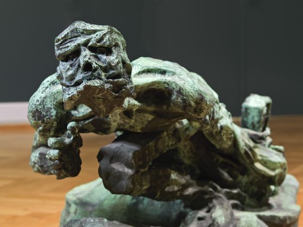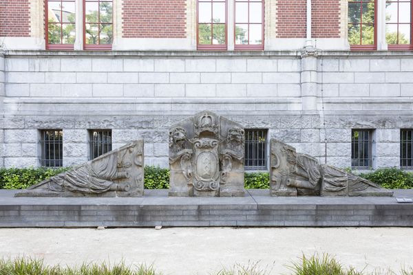 Editor: We’re looking at "Pediment", a stone carving created around 1654-1655 by Hendrick Rusius. It feels very monumental and narrative; a scene frozen in time. What stories do you think this piece is trying to tell through its symbols? Curator: Ah, yes, a frozen narrative indeed! Note the central ship, seemingly tossed about. Do you see how the figures cling to it, or are swept away by the waves rendered to the sides? The cultural memory embedded in such imagery is potent. Maritime struggles and triumphs were crucial to Dutch identity then. What kind of symbolism speaks to you in that context? Editor: I suppose the struggle against the water makes sense given its placement on a building facade; it's like a permanent reminder of human endeavor against the elements. But beyond that simple idea, what else might we see in these particular figures? Curator: Precisely. The ship might represent not only navigation, but also the "Ship of State." Note, too, how the figures on the ship might reference types of people – perhaps commoners to merchants to soldiers? Look closer at the surrounding figures and objects. Do you recognize symbols of trade? Sea monsters that represent external threats, for instance? Each contributes to a complex visual allegory that speaks to a time of both flourishing and immense challenge. Editor: That's a good point! I had not recognized specific classes or threats. So it could also speak to national pride, not just maritime success... That completely changes my perspective! Curator: It does, doesn't it? Rusius masterfully taps into archetypal images that evoke feelings of resilience, ambition, and even anxiety. Visual culture shapes the social consciousness, then and now. I would be keen to learn what symbols do today, how new symbols work now. Editor: Yes, it is fascinating how much historical and emotional depth can be captured in what, at first glance, seems like a simple stone carving. Thanks for unpacking that for me.