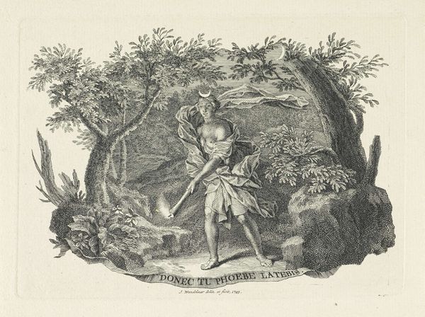 Curator: So, here we have an English tile, dating from between 1757 and 1761, crafted by John Sadler. It resides here at the Metropolitan Museum. What strikes you about it first? Editor: I see a very ordered and stylized landscape; very pretty but very theatrical. Almost like a stage set with these figures acting out a pastoral scene. A shepherd, a shepherdess, a little dog... all contained within that elaborate border. Curator: Indeed, a rather contained world. I am drawn to that border, too – such a profusion of floral and almost confectionary detail framing a quite simple vignette. It feels characteristic of the Rococo era. Editor: Exactly! Those cherubic faces and the vine-like embellishments point toward a yearning for something idealized. Even the shepherd and shepherdess don't look particularly weathered. No farm grime on *their* hands, it seems! What about you? Curator: Absolutely! And in terms of cultural memory, there's a real echo here of those earlier pastoral paintings that depict an idealized, leisurely existence. But also notice that these tiles are often used in very humble domestic spaces like kitchens and dairies! Such an aspiration... Editor: The juxtaposition is fascinating. Luxury design made reproducible and affordable. It's the beginnings of mass culture democratizing aspiration. And the dog...he is just lying there listening to the music, it is a window into the mind-set of that era. Curator: What a beautiful observation; indeed. It almost allows for this idea that there should be time for leisure and appreciation, even in the midst of what must have often been grueling, labor-intensive work. Editor: Perhaps tiles like this served as a daily reminder of beauty, a small luxury in a busy life. That tension between art and utility. I hadn’t thought about that so closely. Curator: And on reflection, it adds yet another layer to a quite simple scene.