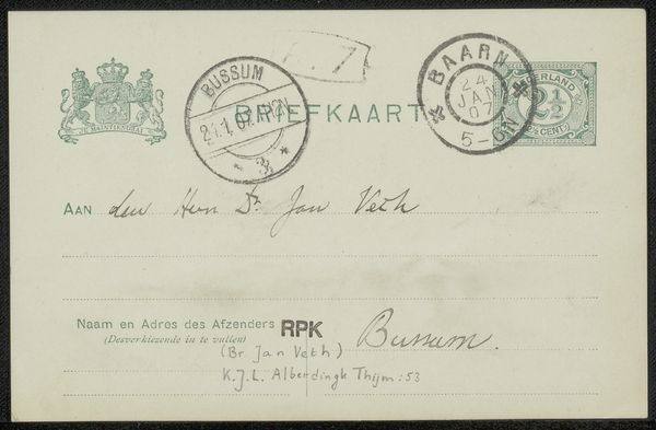 This is a pre-printed postcard to Jan Veth, dating from 1918, written by Karel Johan Lodewijk Alberdingk Thijm. In this small gesture of correspondence, we find ourselves at the intersection of personal communication and broader cultural dynamics during World War I. Thijm's message is directed to Jan Veth, who was an influential figure in the art world. The choice of a postcard for communication speaks to a period of increasing accessibility and democratization of information. It also reflects a society grappling with war, where correspondence became a vital, yet often censored, means of maintaining connections. While the postcard itself may appear simple, it prompts us to reflect on the complexities of identity, and communication during times of conflict. It invites us to consider the subtle ways in which power dynamics influence personal interactions. The handwritten address evokes an emotional connection to a specific moment in time. It is a reminder of the personal stories embedded within historical events.