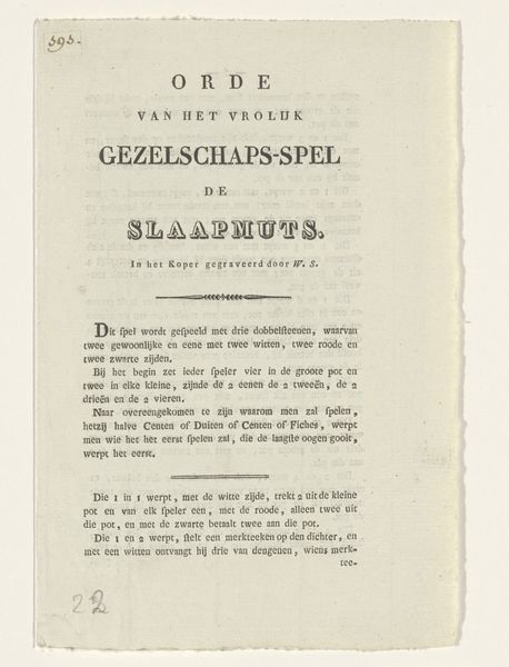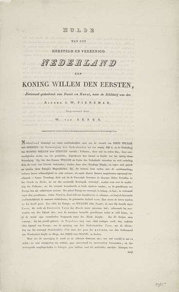Editor: We’re looking at a print from sometime between 1824 and 1847, titled "Tekst bij het grafmonument voor Engelbrecht II, graaf van Nassau-Dillenburg-Breda, 1504." It’s essentially a page of dense text. I'm struck by how official and almost legal it looks, even though it's about a grave. What do you see when you look at this? Curator: This is a fascinating artifact because it reflects a very specific historical moment of national identity formation intertwined with class and power. The text itself becomes a monument. This proclamation performs power by connecting William I, seen here as the founder of the Dutch state, to the noble lineage of Engelbrecht II. How might understanding this text as a *performance* change how we see it? Editor: Performance in what way? It seems more like an informative document, listing facts. Curator: But is it neutral? Note how it positions the House of Nassau as central to the region’s power for generations *before* William I. By emphasizing the lineage and marital alliances of Engelbrecht, particularly his marriage to Johanna, the text constructs a historical narrative that legitimizes later political structures, including inherited power and wealth. It’s less about historical accuracy, more about crafting a legitimizing myth, don't you think? It tells the history from a certain vantage point that actively includes and excludes in ways that shape future views on who held authority. Editor: I see what you mean. It's less about Engelbrecht as a person, and more about using his name and his lineage to reinforce certain power structures that continued for hundreds of years after his death. The language used almost creates a hallowed feel as one reads the description of the land and people over which Engelbrecht reigned. It almost seems like a warning to not make waves... or something along those lines. Thank you! Curator: Precisely! And that carefully constructed historical narrative can be a powerful tool for solidifying political ideologies. Reflecting on this document’s role helps us unpack those ongoing impacts of political ideologies.