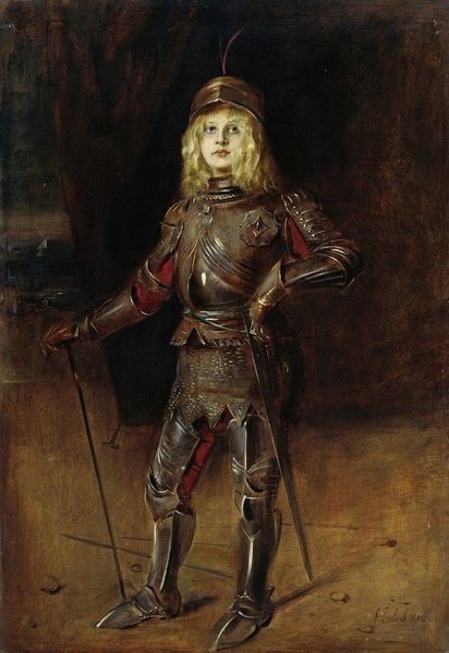 Sir John Everett Millais painted "Joan of Arc" in an unknown year using oil on canvas. Our attention is immediately drawn to the contrast between the cool, metallic armour and the warm red fabric of Joan’s skirt, a contrast that evokes a sense of tension. Millais has structured the composition with Joan at its centre, kneeling, her gaze directed upwards. This vertical orientation emphasizes her spiritual focus, while the armour suggests the earthly conflict she is involved in. The sword, held horizontally, creates a visual division between the upper and lower parts of the painting, between the spiritual and the material. The detailed rendering of the armour, reflecting light and shadow, underscores its solidity and weight. This serves not only to highlight Millais's technical skill but also to emphasize the physical burden Joan carries. The red skirt, a splash of vibrant color, suggests passion, courage, and possibly the sacrifice that awaits her. Ultimately, Millais uses the interplay of color, light, and form to explore the complex interplay of the spiritual and the material, the sacred and the profane.