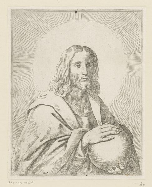 Curator: Here we have an engraving from the Baroque period, titled "Christus" by Ludwig Büsinck, created sometime between 1600 and 1669. Editor: Right away, the face radiates such peace! It's this serenity, but also a sense of...what is it? Distance? Almost melancholy. He holds the world in his hands, but his gaze seems fixed beyond it. Curator: Büsinck’s printmaking here is fascinating. Observe the cross-hatching. This painstaking technique, alongside his masterful use of chiaroscuro, enabled widespread reproduction and distribution of this devotional image. How was this engraving disseminated and received? That is my burning question! Editor: I'm wondering about those sunbeams. It's a very direct halo, and somehow that earnestness hits me in the chest. This isn't a removed, ethereal god. This feels so human, almost touchable. A working-class deity for a print shop distribution, maybe? Curator: Absolutely. The medium informs the message. Printmaking, through workshops and commerce, democratized imagery and disseminated narratives to wider audiences. The commercial aspect can’t be dismissed. Note the subtle modelling, carefully achieved to enhance its appeal. It’s a skillfully marketed salvation. Editor: Hmmm, marketable salvation. I guess faith needs its marketing team, like anything else, huh? Although, seeing him hold that miniature earth, with his tender gesture, it evokes not just power but fragility. Does God worry, too? Silly, maybe, but it really prompts the big "why" questions for me. Curator: What’s exciting for me is considering how labor and capital met belief here. Büsinck, the artisan, produced multiples that then shaped beliefs. This print became an object to own, to contemplate, to maybe alter with personal touches, thus becoming deeply intertwined in people’s daily lives and devotional routines. Editor: That makes the experience far less passive, doesn't it? This makes me imagine where it might have hung...above a fireplace in a bustling tavern, maybe, a silent observer in a busy household? Curator: Precisely! By examining the print's material existence, we unpack broader societal practices, religious conventions, and, crucially, how labor is mobilized and compensated. Editor: It's certainly much more than just the image itself. Curator: It invites critical insight.