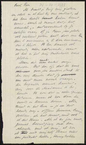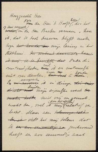 Curator: Here we have a fascinating item from the Rijksmuseum's collection: a letter entitled "Brief aan Etha Fles," potentially dating back to 1889. It's an ink drawing on paper, penned by Jan Veth. Editor: My initial impression is one of intimacy. It's handwritten, with that distinctive ink, almost a script only the recipient could fully decipher. It feels very personal. Curator: Precisely! Veth was deeply involved in the art scene of his time. Letters like this are vital, not just for biographical insights, but to understand the discourse shaping art's role in society then. The letter speaks of sending paintings, museum visits and his artistic circles, it highlights the cultural infrastructure artists operated within. Editor: I'm immediately drawn to references in the letter—mentions of a portrait of the addressee's "papa". Its a question to Etha if she has been sitting for the painting of him and how Lens, which could also be someone is doing. So there's already that psychological weight to be found from its description and contents. Curator: It brings into question notions of patronage, artistic representation, even family dynamics woven into Veth's world. Consider how access to these circles would shape a young artist's trajectory. And even museum collection, to become part of cultural heritage. Editor: I agree. This scrap of paper offers an opening to interpreting the visual symbols with a greater human-driven component. It gives clues to interpersonal artistic exchange which in effect shows how symbolism has emerged, has persisted and the meanings it gained in history. The symbols used such as museums are used today and give meaning to the works that hang within their walls. Curator: Absolutely. A piece like this serves as a lens onto that complex social reality. It's also worth noting his description of going to the museum itself. What that implied in terms of civic engagement back then. Editor: A great reminder that this sort of exchange remains essential, helping make this history relatable for museumgoers even today! Curator: Indeed, hopefully they get a little peek through this message of it, themselves.