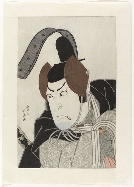 Curator: Utagawa Kunisada created this intriguing woodblock print, titled "Great swords of kabuki collected" around 1864. The Rijksmuseum houses it today. Editor: He looks a bit…constipated? Intense focus perhaps, but I’m immediately drawn to those wild eyes and the set of his jaw. Dramatic stuff! Curator: Precisely! That exaggerated expression, a cornerstone of Kabuki theatre, conveys heightened emotion, a characteristic mirrored across numerous Ukiyo-e prints. This, of course, speaks to the powerful cultural symbolism embedded in theatrical performance itself, informing popular perceptions and consolidating a collective visual language. Editor: I get it. It's like the silent film era—all the emotional projection happens through facial exaggeration. But look at those geometric patterns, that slightly unsettling repetition in his robe and the backdrop…and those birds—what’s going on there? Is this a comedy or tragedy? Curator: Perhaps a blending of both, reflective of the nuanced narrative worlds conjured in Kabuki itself. The geometric patterns of the costume, in juxtaposition with the birds soaring freely in the sky, creates a layered visual narrative about constraint and liberation, which is further underscored by the figure's stern visage against a landscape dotted with textual elements. Editor: Text as landscape! I love that idea. The writing does add a visual depth, making the composition feel densely packed, but that's really typical of many prints from this period, right? Still, I can't shake the feeling of almost theatrical…anguish here. Even the blue is so sharp. Curator: That intensity aligns perfectly with Ukiyo-e's role as a disseminator of cultural values and ideals. This specific portrait speaks directly to the Kabuki tradition by preserving and conveying very specific emotional registers expected in this unique form of dramatic performance, immortalizing it in the popular imagination. Editor: So, we’re really looking at a preserved, distilled expression, frozen in time. Suddenly I feel more sympathy for his plight, whatever drama is unfolding in that painted face. A real testament to Kabuki’s enduring power, don't you think? Curator: Absolutely, and Kunisada masterfully captured its very essence here, inviting ongoing interpretation for modern viewers.