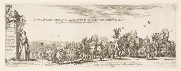 Stefano della Bella created this print, "The Entrance of the Polish Ambassador into Rome," sometime in the mid-17th century, using etching. Etching is an indirect process, meaning the artist doesn't directly incise the plate. Instead, a metal plate is coated with a waxy ground, and the artist draws through it with a needle, exposing the metal. The plate is then immersed in acid, which bites into the exposed lines. The longer the plate remains in the acid, the deeper the lines. In this particular print, it is fascinating to consider the labour involved, not just in its making, but in the event it depicts. The print immortalizes a moment of political theatre, a grand entrance intended to impress. The procession is meticulously detailed, conveying the opulence and power of both the Polish ambassador and the Medici family, whose coat of arms is prominently displayed. Ultimately, this print prompts reflection on the relationship between art, labor, and social status in the 17th century. It challenges our understanding of art by demonstrating how printmaking can immortalize ephemeral events.
