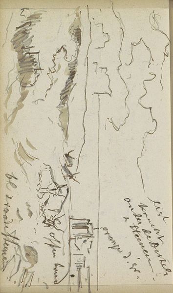 Here is a pencil drawing of Kasteelruïne op de Desenberg bij Warburg by Johannes Tavenraat. In the 19th century, landscape art was not just about pretty scenery; it was deeply connected to ideas of national identity and historical memory. Tavenraat, part of a generation grappling with what it meant to be Dutch, turns to the land to find and define that identity. Notice how the ruins of the castle sit atop the hill, rendered with delicate yet precise lines. This isn't just a depiction of a place; it's an engagement with history. The ruined castle speaks of time, of battles fought and lost, of a past that continues to haunt the present. The choice of a ruin, suggests a reflection on the impermanence of power and the inevitable decay of human constructions. It invites us to consider our place within a continuum of history, prompting questions about what we preserve, what we forget, and how we build upon the foundations of the past.