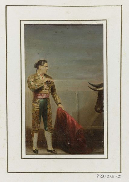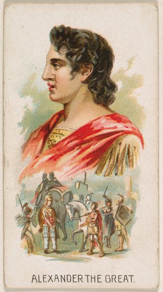 Curator: This is "Julius Caesar," part of the Leaders series (N222) issued by Kinney Bros. in 1888. These were printed as trade cards by the Kinney Brothers Tobacco Company. Editor: My first impression is that it is trying to be majestic, with the laurel wreath, but the colours and materials give it a very… commercial, mass-produced feel. It almost looks like something you would find on a pack of sweets, not fine art. Curator: That’s right. Trade cards served primarily as advertising. Circulated with consumer products, these images reached a broad public, disseminating ideas about historical figures in conjunction with commerce. Note how Caesar is styled. Editor: The color palette feels somewhat subdued; like it was quickly produced with readily available, inexpensive colored pencils and printing methods of the time, not so interested in capturing an accurate likeness, and more interested in distributing widely. It reduces a historical figure to an image to sell tobacco. Curator: Exactly, we need to consider the role that printmaking had in constructing national and cultural identity during the 19th century. What do you think is communicated about leadership through this image? Editor: Well, we have Caesar in profile, which automatically recalls classical portraiture and authority. However, by pairing the figure with an easily accessible tobacco product, his importance seems somehow… diminished. Curator: Yet the profile view also historicizes the man and positions him for audiences as part of a recognizable past, associating that history, and by extension power, with the company. Editor: That small vignette at the bottom feels significant too; is that the assassination? The material limitations and the methods employed for such small reproductions give it an almost abstract aesthetic today, however this work also challenges what we consider ‘high art’ versus simple advertisement. Curator: Definitely. Even its existence within the Met’s collection blurs these assumed boundaries. Ultimately, this simple, unassuming card shows the complex relationship between commercial interests and cultural values in late 19th-century America. Editor: Right. Examining how material production intertwined with cultural narratives, we start to notice how mass consumption shapes and frames even the figures we consider immortal.