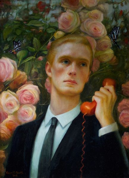 Curator: This is "Portrait of Niclas Gillis," a figurative painting rendered in oil-paint, by Adrian Gottlieb. Editor: It’s funny, the first thing I notice is the dark, almost cavernous background—it feels like peering into someone’s private thoughts. He looks so thoughtful. Is it the way he's holding that book? Curator: Absolutely. Gottlieb works in a very specific realist tradition. It's not simply about capturing a likeness, but conveying a certain sense of social standing and interiority. Portraiture like this often served to legitimize an individual's place in society. The book certainly emphasizes Niclas' intellectual or artistic sensibilities, right? Editor: Oh, without a doubt. But beyond the book and the somewhat proper attire, there’s a real vulnerability there, especially in his gaze. It feels so immediate, like I've interrupted his reverie. Makes me wonder what he's contemplating! You know, a love letter, a cryptic chord? The shadows sort of help draw this inner world in! Curator: Gottlieb’s technique clearly owes a debt to the Old Masters, particularly in his use of chiaroscuro. Notice how the light illuminates Niclas’ face and hands, drawing our attention to his expression and that telling book, creating a focal point against that heavy background, you mentioned. That's strategic use of light to convey psychological depth, aligning the painting within that historical portrait tradition. Editor: Right, it pulls you in. But the softness also brings in some warmth in that stern appearance, something intimate in what otherwise feels somewhat formal. It feels a bit like catching him unguarded! A really arresting and moving work. I find myself hoping there's an answer somewhere in those sheet notes in the book. Curator: It definitely captures that delicate balance between public persona and private contemplation that portraiture, historically, always grappled with representing. Editor: A captivating look, no doubt! Curator: I concur. This artwork manages to provide the feeling that what we are facing is an invitation to engage not just with an image, but with the very person, the individual Niclas Gillis represented here.