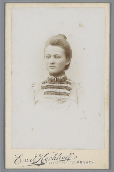 This small portrait of an unknown woman was created by Atelier Studio in Haarlem. The studio likely produced this portrait as a carte-de-visite, a popular and affordable form of photography in the late 19th century. Looking at her, I'm struck by the way she presents herself. Her high-necked, lace-trimmed dress speaks to the restrictive fashion norms of the time, yet there's a quiet dignity in her gaze that transcends those constraints. She's not just a face in a crowd; she's an individual asserting her presence in a world that often tried to diminish women's voices. This photograph is more than just an image, it's a testament to the power of representation and the resilience of the human spirit. It encourages us to reflect on the stories of countless women whose contributions have been historically overlooked.