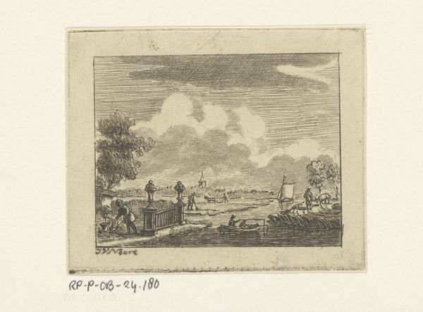 Curator: What a find! This little etching, "Waterlandschap met koe," or "Waterscape with Cow," is attributed to Ernst Willem Jan Bagelaar, dating back to between 1798 and 1837. Isn't it captivating? Editor: It is! Immediately, I'm drawn to the light. It's as though the artist bottled a particularly misty morning. Everything feels a little…transient. Curator: That transience, I think, comes from Bagelaar's masterful use of line. Look how he suggests detail, creating depth and atmosphere. This wasn't meant to be a photorealistic representation, more a fleeting impression of a Dutch landscape. We’re talking romanticism leaning towards realism, capturing an idealized version of nature and rural life. Editor: Yes, exactly! The lone cow standing in the water is almost dreamlike. But that romanticism has edges—that sparse tree on the left has such personality. It makes the whole scene feel incredibly present. What's also curious to me is that, through its details, we are looking at more than simply rural, idealized landscapes. How can we reconcile this fact? Curator: Ah, a very good point! We shouldn't forget that landscape art was increasingly becoming tied to ideas of nationhood and belonging. There's a quiet celebration of Dutch identity in the simplicity of the scene. This sort of thing helped reinforce what it meant to be Dutch during a period of national formation and shifting political power. It makes this simple artwork quietly political, doesn't it? Editor: Absolutely. But also intimate. Almost like a postcard of the soul. Its black-and-white rendering is soothing. The whole artwork inspires introspection—it makes me yearn for somewhere quiet and green. It shows how we use places as spaces where meaning and memories are shaped and cultivated. Curator: I quite agree. Looking closely at Bagelaar's landscapes teaches us something new each time. Thank you for the stimulating exchange! Editor: The pleasure was mine.