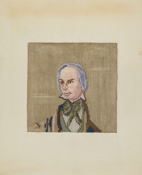 Editor: So this is “Needlepoint Picture,” around 1937, by Jules Lefevere. The use of textile really makes this portrait feel unexpectedly domestic, even intimate. What do you make of this merging of craft and portraiture? Curator: It's compelling because it challenges the hierarchy of art forms. We see 'fibre-art' typically associated with domestic labor, elevated to the realm of portraiture, which historically conveyed status. The deliberate use of needlepoint subverts notions of high art and its typical consumers, doesn't it? Editor: It really does. Considering its scale, did Lefevere choose this medium for artistic accessibility or maybe because he liked the way a traditional craft rendered a traditional portrait? Curator: We have to consider the time: 1937. Mass production was transforming society and domesticity. Was Lefevere engaging in a nostalgic practice? A resistance to industrialized art making? How does the labor intensive process speak to this shift in art? Is it accessible at all? Is it making some ironic statement? Editor: The pixelated effect that the needlepoint creates does feel like an odd foreshadowing of digital art! Curator: Exactly! And it forces us to consider labor - the painstaking effort involved, in stark contrast to mechanical reproduction. Where does value truly lie? In the final image or the intensive, unseen hours that are required for the making of the work? Editor: This piece makes you consider art as work and labor, things I usually wouldn’t think about, thanks for the insights. Curator: It does invite some challenging questions! Hopefully the perspective is interesting for other people as well.