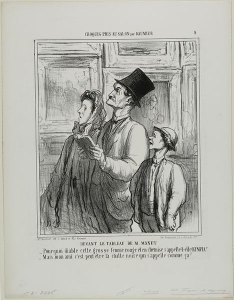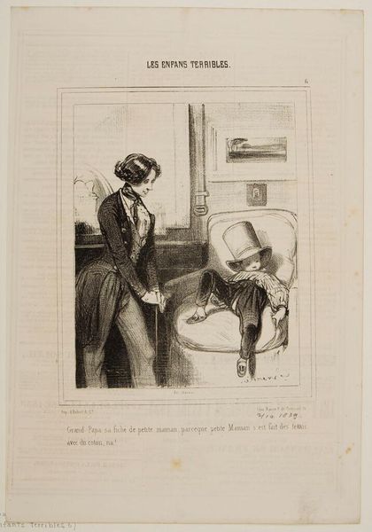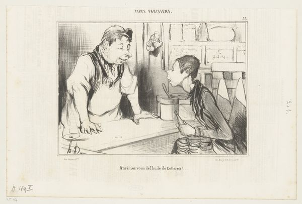 Curator: Honoré Daumier's lithograph, "Do you see, little one, you're wrong..." presents a seemingly simple domestic scene. The original resides here at Harvard Art Museums. Editor: The contrast of light and dark creates a somber mood. Notice the man’s gaunt figure as he prepares food. What does this say about the materiality of labor? Curator: It's a pointed social critique published during a period of significant political tension. The artist subtly comments on the role of political discourse in everyday life. Editor: The image's title seems to suggest a forced or indoctrinated perspective. It prompts us to consider the shaping of views, especially among young people. Curator: Indeed, the print implicates the viewer in a societal conversation, where class structures influence opinions. Editor: This print reminds me of the tangible conditions under which ideologies are constructed and disseminated. Curator: Precisely, and Daumier’s work helps us see how art can be a catalyst for social change and reflection. Editor: Yes, art can reveal that the political is often embedded in the daily grind.