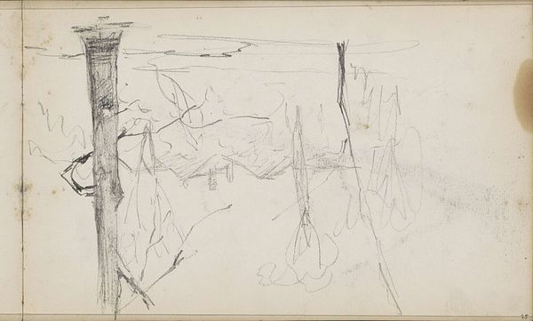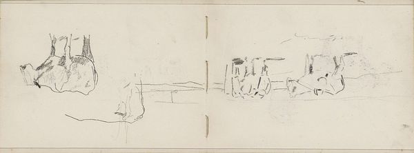 Curator: Ah, to come across this intimate sketch! This is "Liggende en staande koe in een weiland" ("Lying and Standing Cow in a Meadow") by Anton Mauve, likely dating between 1848 and 1888. It's a pencil drawing, probably done en plein air, capturing a fleeting moment in the Dutch countryside. Editor: My first impression is tranquility. It's just so… simple. You can almost hear the quiet rustle of grass, the distant lowing. The cows seem so unbothered by everything. It's the ultimate chill. Curator: Absolutely! And what seems so straightforward belies a deeper connection to artistic and societal currents. Mauve was a significant figure in the Hague School, part of a movement consciously reacting against academic romanticism, embracing a more realistic and intimate portrayal of Dutch life and landscape. Editor: It feels very… un-grand, if that makes sense. There’s no pretense here. The artist isn't trying to impress anyone with skill but inviting us into their most direct experience of witnessing these creatures. It's almost like eavesdropping on Mauve's creative process. I feel like I shouldn’t even be looking at it! Curator: Precisely! The loose, suggestive lines indicate a working sketch rather than a finished presentation piece. Yet, this immediacy became central to the aesthetic value system being formulated within these realist circles. Representing modern life meant capturing its transient, ephemeral nature. Think of the influence this had on Impressionism. Editor: I suppose. But for me, this transcends art history. It is evocative of the raw connection between humanity and nature before concrete took over and cities grew bigger. There is something fundamentally soothing in that simplicity. Curator: You touch on an essential point. Beyond art-historical classifications, a work like this offers a pathway towards re-centering values within a culture perpetually accelerating away from this mode of observation. Editor: Exactly. Seeing art in such a state of gestation kind of takes away the preciousness we often attribute to it. This suggests an alternative story. The story is: let’s start from an immediate feeling. It is all right to do something imperfectly if your intention is true. Curator: That perfectly captures its essence: a call toward feeling and intentional observation, where the final outcome always serves as merely a footnote to the entire endeavor.