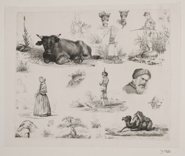 Frances Flora Bond Palmer created this page of lithographic sketches for "The New York Drawing Book." Here, the organization of the vignettes is immediately striking, dividing the sheet into distinct zones of pastoral life. Palmer uses a delicate yet precise lithographic technique, emphasizing line and tonal variation. The composition reflects an interest in the picturesque, where nature is presented as an aesthetic ideal. Notice how the sheep, cows, and wood-gatherer are rendered with attention to texture and form, their placement creating a harmonious balance. The structure of these vignettes invites us to consider the relationship between humans and nature. Each scene, bordered by its own implied frame, presents a self-contained world where work and the landscape are intertwined. Palmer's formalism here, while seemingly straightforward, subtly challenges any fixed notions of rural life. Instead, the artwork prompts us to contemplate the complexities of representing the natural world.