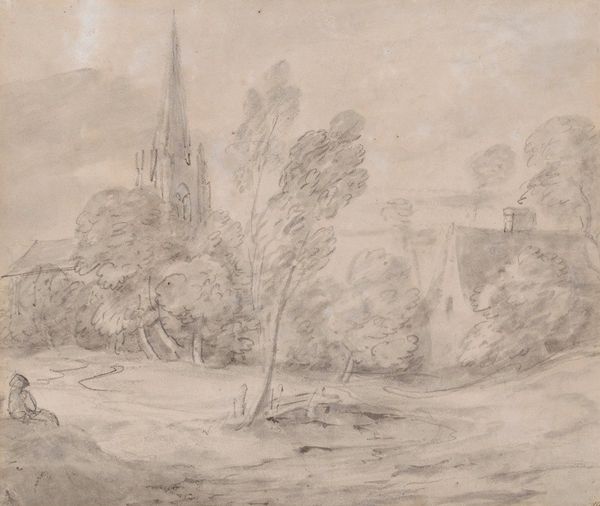 Editor: This is Thomas Girtin’s watercolour, *Chichester Cathedral from the South West*. It's quite a small work. The muted colors create a peaceful, almost dreamy feeling. What do you see in this piece? Curator: It’s a lovely, intimate view. I’m drawn to how Girtin captures the sheer scale of the cathedral, yet softens it with those resting cows. What do you think that contrast suggests? Perhaps the eternal set against the everyday? Editor: I hadn't considered that, but it brings a different perspective to the cathedral's presence in the landscape. The subdued tones now seem to emphasize that contrast even more! Curator: Precisely! Girtin had a remarkable ability to evoke mood. Editor: I'll certainly look at Girtin's art differently now. Thanks! Curator: My pleasure. Art is an ongoing conversation, isn't it?