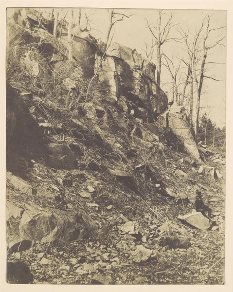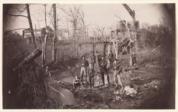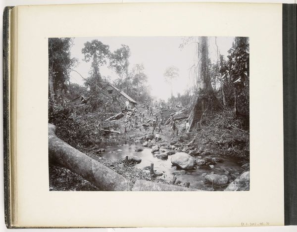 Curator: This gelatin silver print, created between 1914 and 1915, is titled "Deze trein Duitsche automobiel-vrachtwagens in het woud van Villers-Cotteret…," quite a mouthful. It documents the retreat of German forces after the First Battle of the Marne. Editor: My first impression is how eerie and quiet it seems, despite the destruction. There's this stillness, emphasized by the lone figure with a bicycle amidst the wreckage. Curator: Yes, the wreckage is central. Notice the twisted metal of the trucks—materials fundamentally altered by conflict, stripped of their industrial purpose and reduced to debris. The means of war laid bare, reflecting on mass production and the consequences of consumption, of both materials and lives. Editor: Absolutely. This photograph captures the devastating impact of war. It speaks volumes about the sociopolitical and historical landscape, the great powers clashing. I think the image presents a crucial interrogation into whose labor and materials fuel conflict, and who profits. Curator: Consider the medium too. Gelatin silver prints, then a relatively new technology for capturing the stark realities of war. It brings the experience to a wider audience, influencing public opinion through visible documentation. The way the light interacts with the silver is, in and of itself, a complex material process. Editor: It makes you wonder about the photographer's access, their potential biases, and the editorial process behind disseminating such potent imagery to the public. Photojournalism holds power and demands responsibility. Curator: Indeed. Looking closer, consider the physical act of salvaging or collecting remnants on that path… It's compelling to imagine these scraps ending up repurposed. The inherent utility even in wreckage reflects both desperation and a tenacious will to reuse discarded material. Editor: Ultimately, it is a reminder of the deep scars war leaves behind—both visible and invisible, impacting not just landscapes but also the collective psyche. These burnt vehicles function as material testimonies of an intersectional history. Curator: It gives a sense of reflection upon the environmental and material waste created from that landscape as a space. Editor: Yes. It is an impactful photograph.